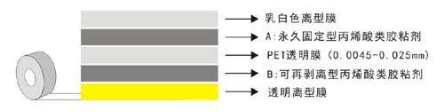 采用高透、高亮的基材涂以丙烯酸酯类的胶粘剂,双面差异。有多种厚度基材供选择。