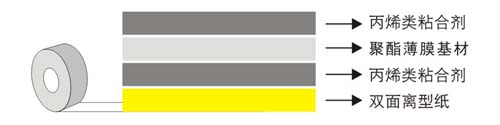 - {采用黑色PET基材,并在黑色PET基材上涂压敏胶合剂的双面胶带。具有优良的遮光性和粘合力。 针对各种粘附体均显示出良好的粘合性。 抗反弹、翘曲,耐热、耐温性佳。