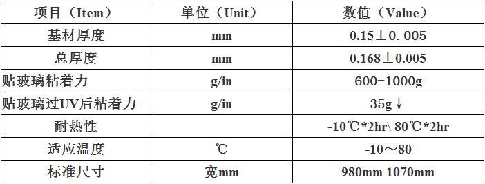 紫外线防护使用PO膜或者PET膜作为衬底,涂以丙烯酸粘合剂PET离型膜。